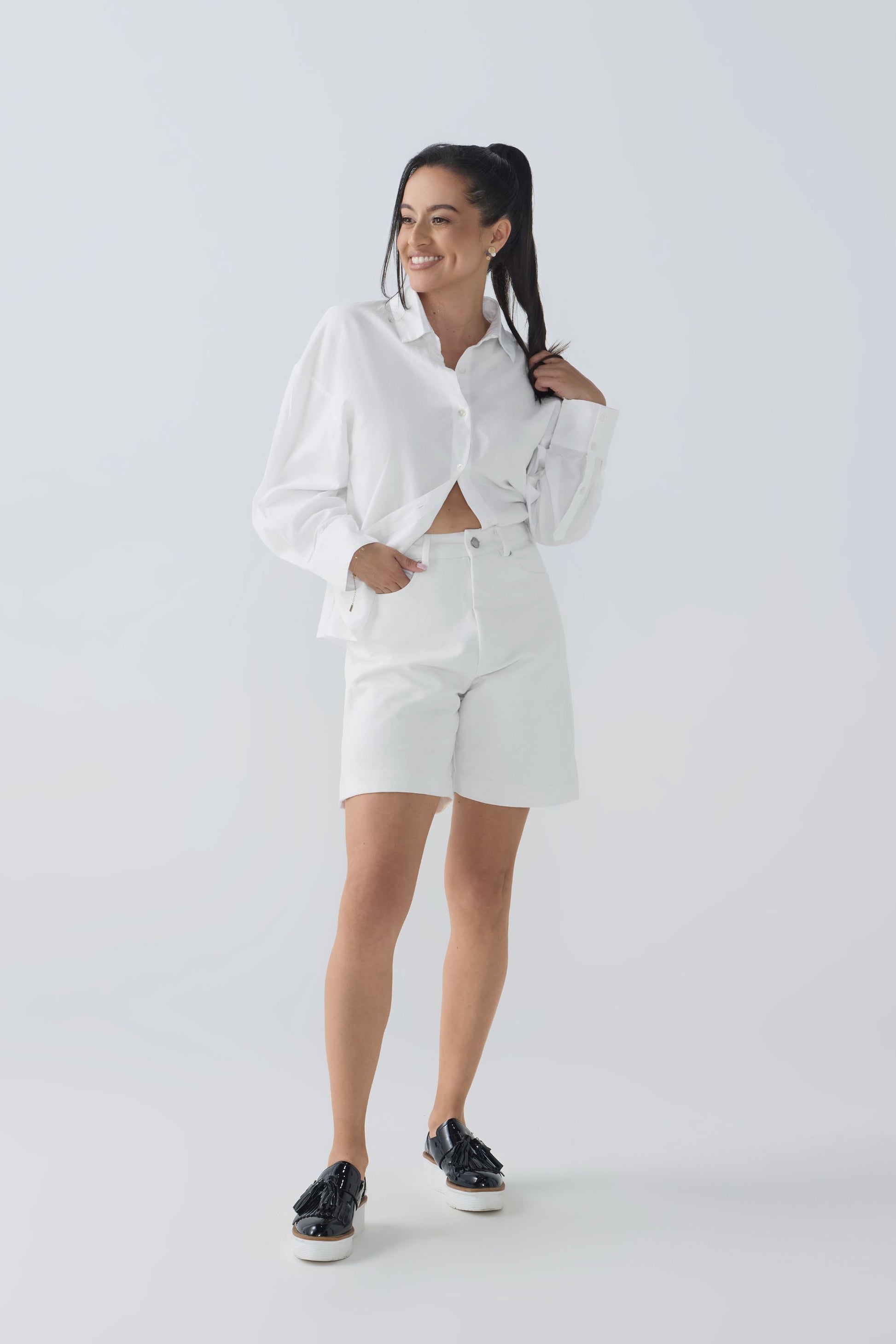 Fit Label: High-rise, mid-thigh length, straight-cut silhouette