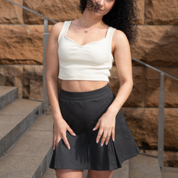 High-waisted mini with clean box pleats and subtle flare